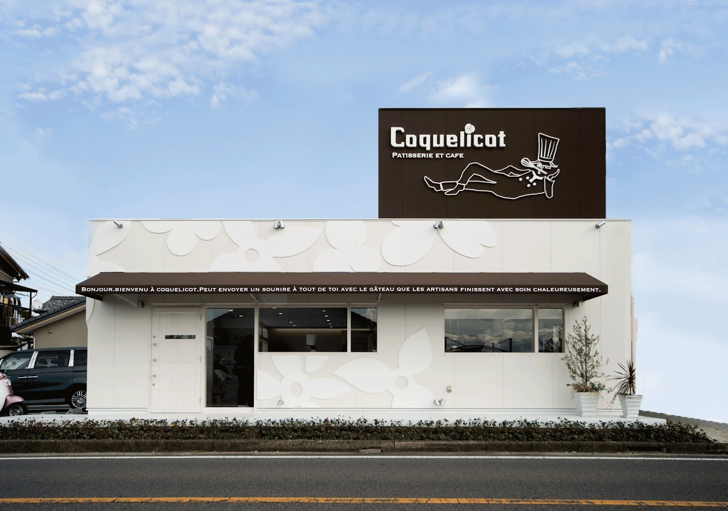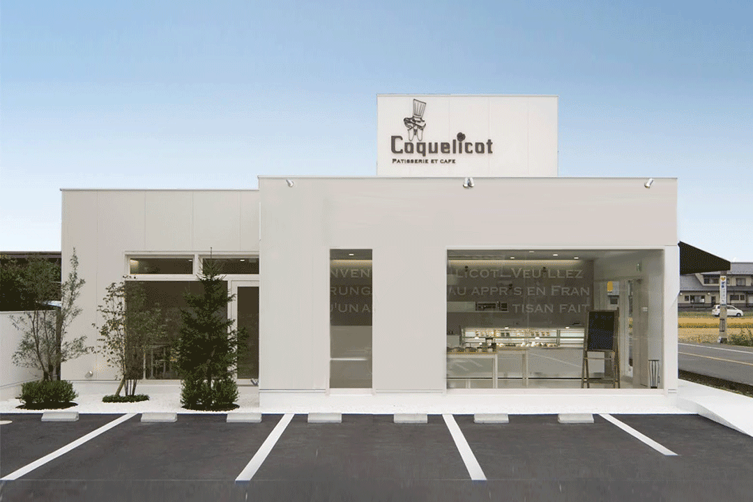 ボギーのデザイン設計実績の中で、看板がとても大きな役割を果たしていると感じるのは、↓の洋菓子店・カフェのcoquelicot(コクリコ)さん。