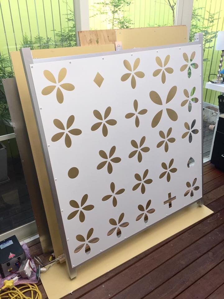 これなーんだ! 建物外壁に取り付くもう1枚の外壁 (2重外壁と呼んでます) 。レーザーカットした穴から中の外壁に塗装された4色のイエローが見えて、間接照明が幻想感... -