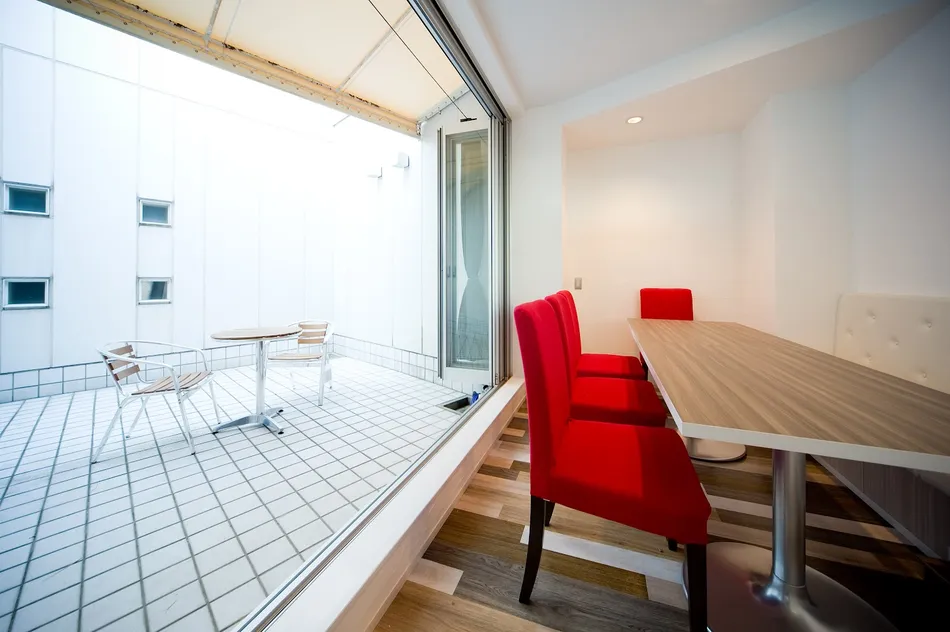 真っ先に内装デザインとして、15種類位の赤い大きさの違う質の違うタイルを用意して、それを壁面にラインを何層にも重ねて貼ったりすることで、同じ赤でも種類の違う赤を並べることによって個性を演出しています。