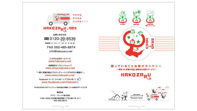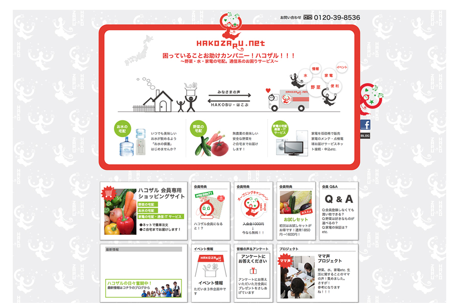 野菜・水・家電の宅配、通信系のお困りサービス”困っていることお助けカンパニー!ハコザル!!!”です!みなさんの声にお答えして、ハコザルくんと共に愛と笑顔を運んでくれます♪ グラフィックはエコカイロやお面など、一味違ったものができました!