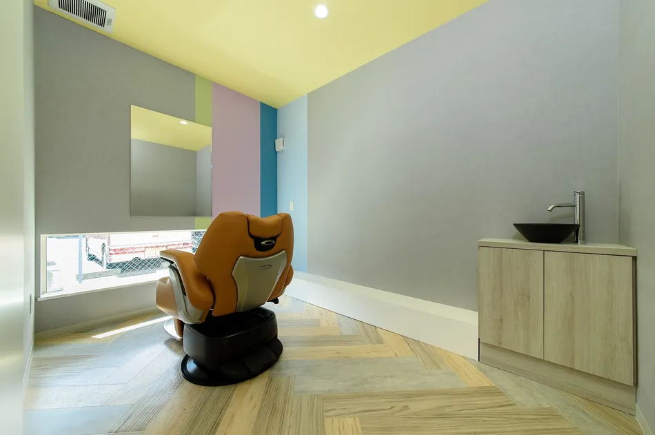 エステメニューもあるので女性の方にもオススメ! 子どもから大人まで来店していただけます!白とグレーのシンプルな外壁に、ロゴ入りのカラフルなサイコロサインが目印ですよ〜!