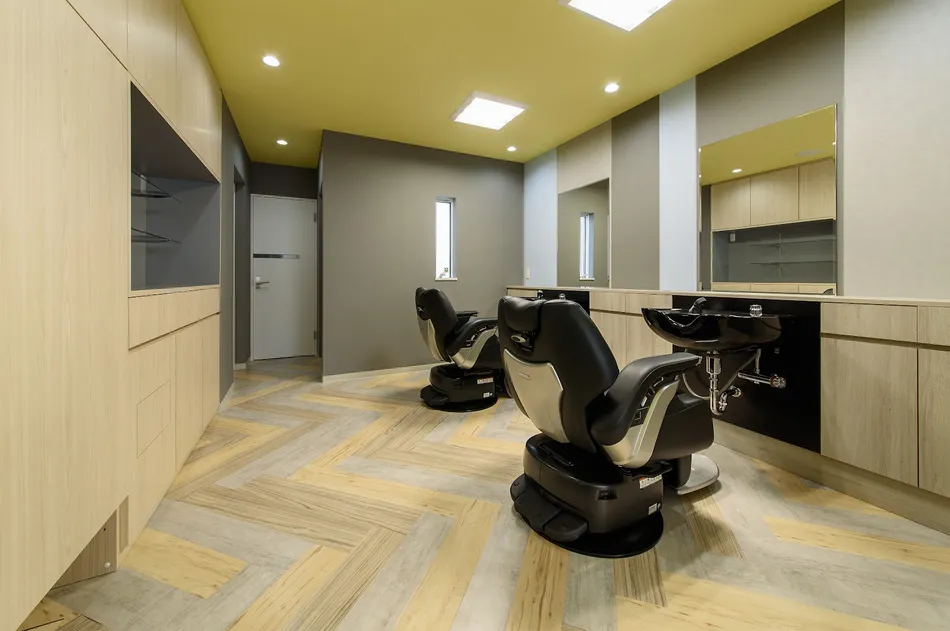移転新築した名古屋市南区の理容室。店舗建築から外観、インテリア、サインなどトータルでデザインをお手伝いしました!