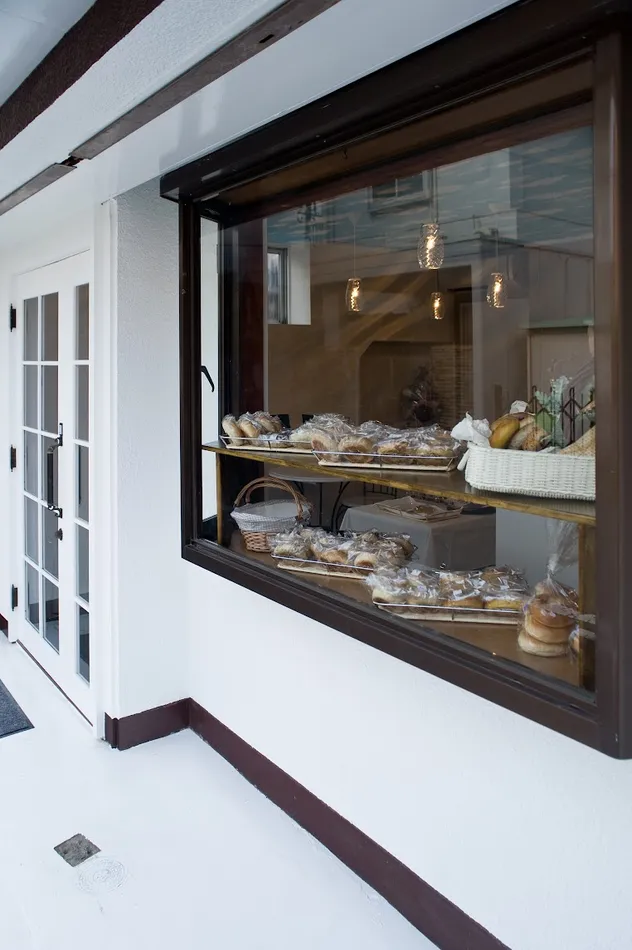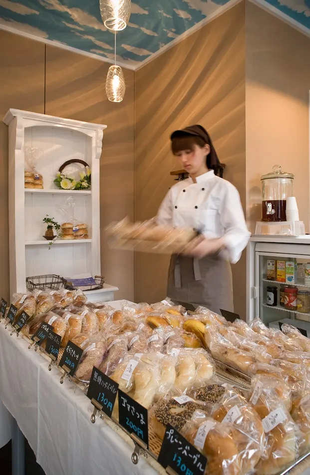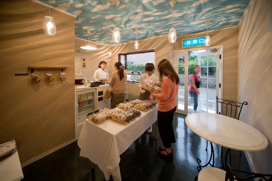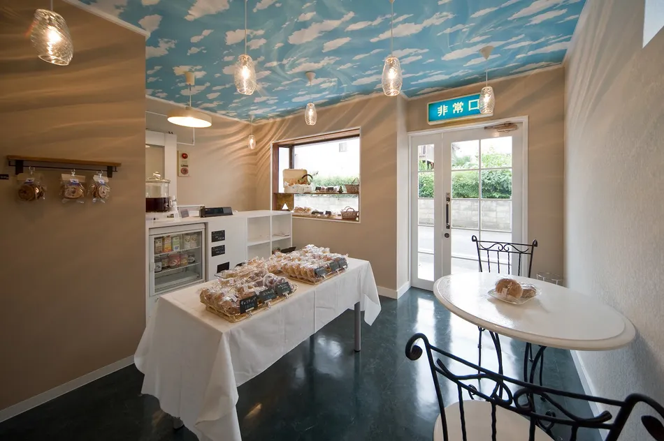 一つ一つ、手作りで添加物を使用しない、自然の味わいを大事にしているベーグルが自慢のお店です。 お店のロゴ&マークでも用いられた飛行機が連想される空模様の天井がバッチリと映える空間となりました! 美味しいベーグルは通販でもお買い求めいただけるので、ぜひご利用下さいませ~!
