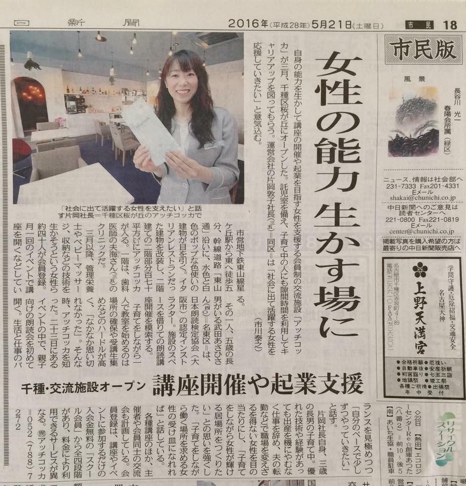 ちょうど1年前の今日!施設デザインほかお手伝いさせてもらった「アッチコッカ」さんが今朝の中日新聞で紹介されました!!身内のことの様に嬉しいです!!(*^^*)社会の...